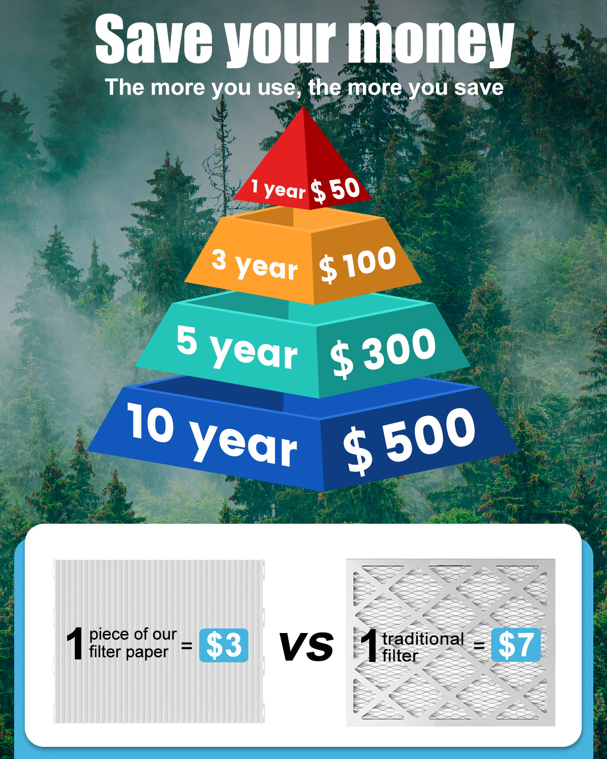 Reduce Pollution: Our filter are made from environmentally friendly materials and are 100% recyclable. The foldable frame can be reused for over 10 years, reducing disposable pollution. The filter media naturally degrades outdoors within 90 days without harming the environment. Reducing waste while enjoying fresh indoor air is a win-win for you and the planet